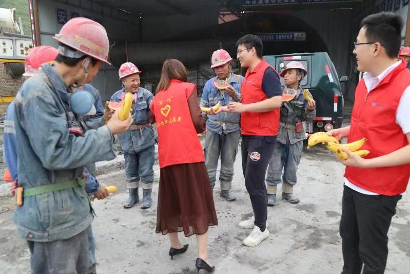 6月17日,新实业公司团委及第二批次下基层队员在天云煤矿开展“情系一线、夏送清凉”活动,慰问奋战在新天云矿井建设岗位上的一线干部职工。新实业公司团委购买了大量当季水果及消暑品,由公司青年志愿者深入井口、区队,逐一送到煤矿工人手中,为一线工人带来丝丝清凉,感谢他们一直以来为悦达能源事业作出的无私奉献,激励他们战高温、斗酷暑,实现煤矿安全生产。