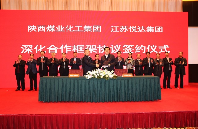 王连春在致辞中说,自2004年悦达与陕煤化集团合作以来,经过15年的亲密合作,结下了兄弟般的深厚友情,已经成为苏陕两省企业合作的典范。近年来,陕煤化集团把握国家供给侧结构性改革的历史机遇,确立了“以科技和资本为驱动,去杂归核,错位创新,把陕煤化转型成为一个煤炭优势明显,能源和材料主业突出的错位多元企业”的发展战略和“以煤为基,能材并进,技融双驱、蜕变转型”的发展模式。不断加快企业改革发展,积极推进转型升级,推动集团公司安全高效、绿色低碳、可持续发展,成为世界一流优秀企业。陕煤化集团在宏观政策把握、战略方向调整、产业结构调整方面的经验做法值得悦达学习。王连春表示,在新一轮苏陕合作的大背景下,悦达集团与陕煤化集团签署深化合作框架协议,涉及新能源、新材料、煤炭物流、煤电一体化等多个领域。他希望以此次签约为新的起点,双方进一步深化合作,全面合作,高水平合作,打造悦达与陕煤化2.0版合作模式。